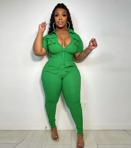 This plus-size jumpsuit is crafted from premium stretch fabric that moves with your body while holding shape. The bold front zipper allows for adjustable attitude — zip it up for sleek polish or down for that undeniable edge. Sculptural stereo pockets add dimension and depth, bringing a modern utility vibe to a silhouette that’s anything but ordinary.