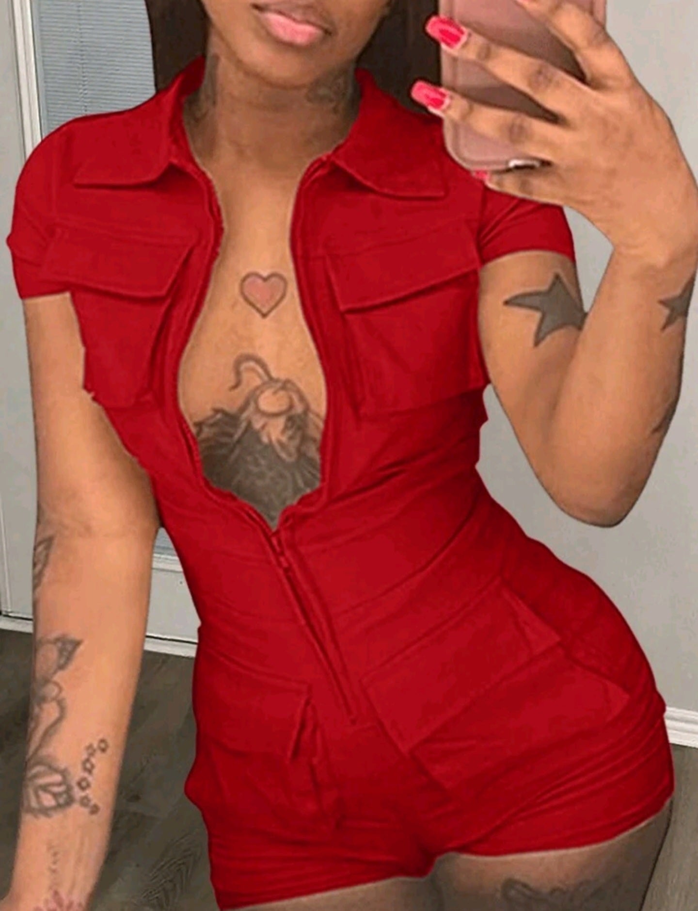 Command the room in Crimson Command, a sultry yet sophisticated one-piece designed for the daring diva. This rich scarlet romper features a curve-enhancing silhouette with a sleek front zipper that lets you control the heat. Luxe cargo-style chest and hip pockets add an edgy, utility-chic vibe, while the tailored short sleeves and high-cut legs sculpt your body to perfection. Whether you're stepping out for cocktails or taking over the night, this piece is your secret weapon of confidence and class.