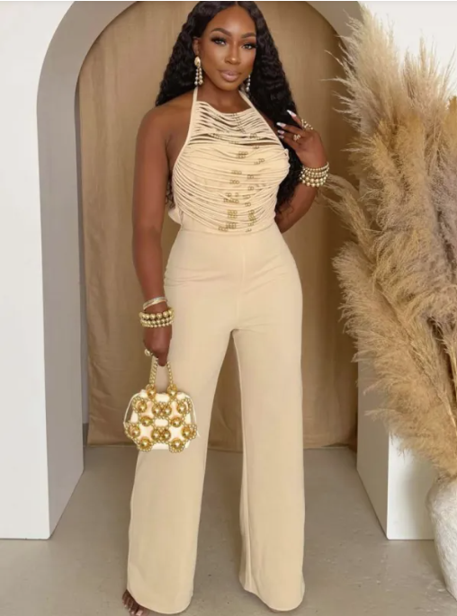 Features: High neckline, open back, sleeveless design, flowing wide-leg fit