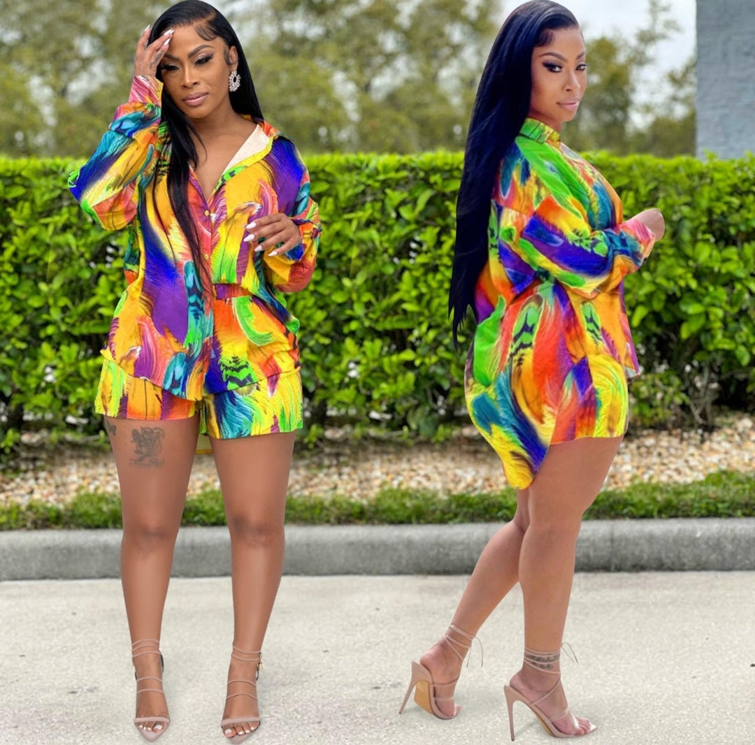 Crafted from a lightweight, satin-touch fabric with a luminous sheen, this look features a button-down top that can be styled open or cinched for drama. Paired with curve-celebrating shorts that offer both comfort and allure, the ensemble dances with strokes of vivid neon—sunset orange, ocean blue, tropical green, and passion purple. Every color whispers freedom. Every step screams luxury.