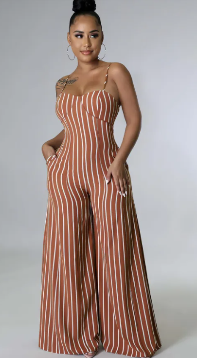 This wide-leg jumpsuit features a sensual open-back cut with slim sling straps and an elongated silhouette that moves like liquid luxury. The bold striped print elongates the frame, while the soft, breathable fabric drapes effortlessly, creating a look that’s as comfortable as it is unforgettable.