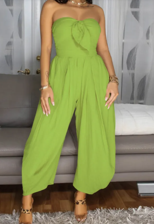 a sultry, strapless silhouette that blends breezy elegance with rich, understated allure. Wrapped in smooth, slightly stretchy polyester, this piece drapes effortlessly across the chest and flows into a relaxed, wide-leg cut that moves with you like liquid sunshine.